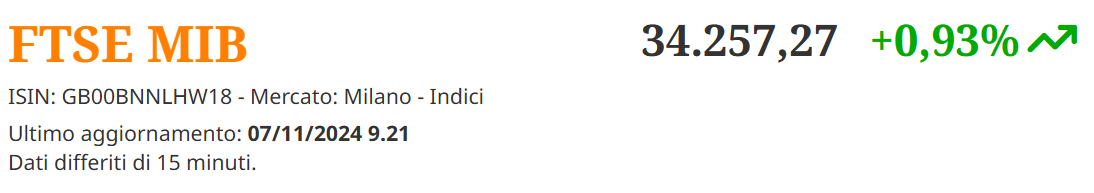 Dopo la vittoria di Donald Trump nelle elezioni USA, le Borse europee chiudono in rialzo. A Milano, l'indice Ftse Mib riduce i guadagni nel finale ma conclude comunque sopra la parità, registrando un +0,1%. La seduta è stata sostenuta dal forte rally di Iveco (+10,7%) dopo i conti superiori alle attese, la conferma delle guidance 2024 e la prospettiva positiva per il 2025, e Banco BPM (+9%), quest'ultima in crescita dopo l'annuncio dell’Opa su Anima.