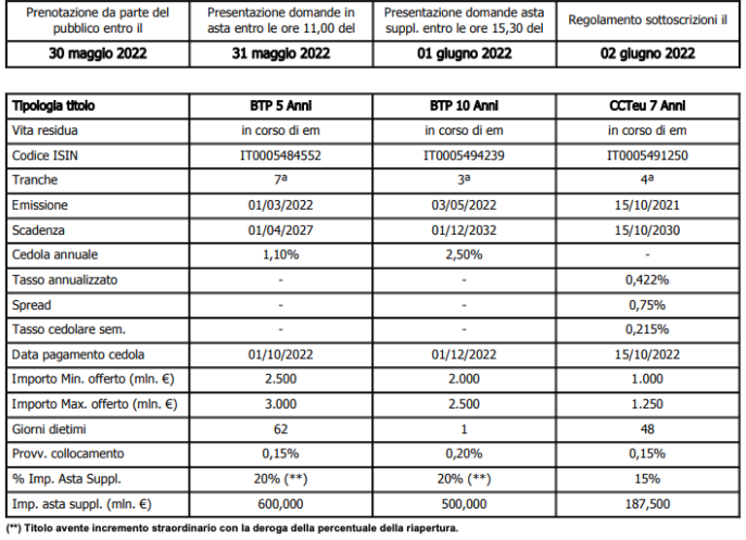 A decorrere dall’emissione, i BTP 10 Anni (03 mag 2022/01 dic 2032 ISIN IT0005494239) sono ammessi all’attività di stripping.