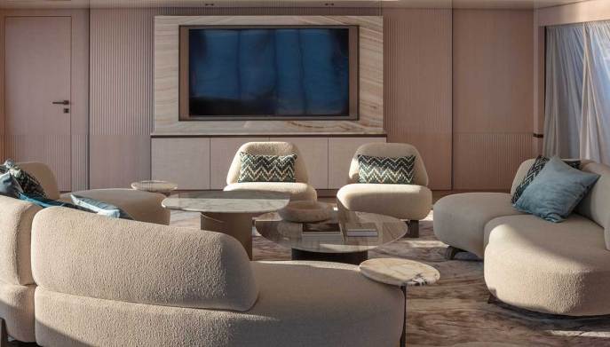 L’eccellenza del Made in Italy è esaltata anche dagli arredi: sedute Ortigia di Flexform, sedia Curve di Poliform, e illuminazione Tropico di FontanaArte per la zona ufficio. Altri marchi presenti sono Fendi Casa, Poltrona Frau, Paola Lenti e De Castelli, il tutto accompagnato dall’illuminazione di Flos, per creare la perfetta atmosfera domestica sullo yacht.